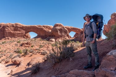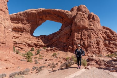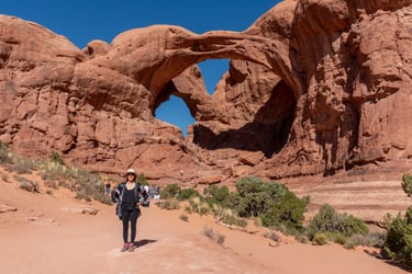 After Balance Rock we turned right on The Windows Road to get to the parking for Double Arch, North Window, South Window, and Turret Arch. Just a short walk from the parking lot, we did the Double Arch trail first and these arches stand 34 m and 44 m tall.