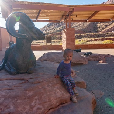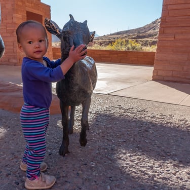 We visited the park in mid-October and the line for entry was about 15 mins. We found that the park had done a fantastic job managing the crowds and we were able to leisurely enjoy these natural wonders. We started our day at the Visitor center where Aliya had fun playing around the rocks and wildlife statues at the entrance.