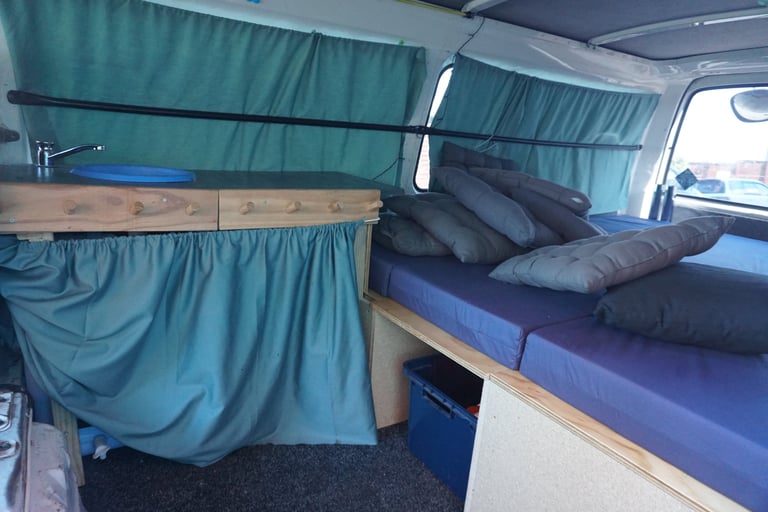 Our search led us to a company by the name of Campervan World. We went there and looked at what they had. They didn’t have much of a selection to be honest. We looked at a Nissan Homey and an SUV that had a rooftop tent. The Nissan Homey was built out with a double bed with storage underneath, a small counter with a sink, and separate containers for fresh water and wastewater.
