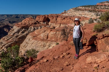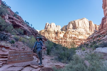 Cassidy Arch is a massive arch that you can stand on top of. The surrounding views of the valley and red rock formations are spectacular. You start the trail in the Capitol Gorge trail and then at the Cassidy Arch sign you turn left up the gorge wall to make your way towards Cassidy Arch. The trail was well marked until near the end where the entire trail was slickrock and only a few cairns (rock piles) lead the way.