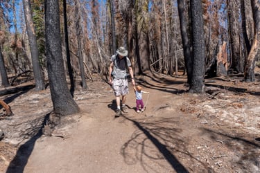 Recently Lassen Volcanic National Park has been plagued by devastating forest fires. It was evident on sections of the Kings Creek trails that these fires had a significant impact. The flames have consumed vast expanses, leaving behind charred remains and a sense of loss. The once vibrant and lush greenery has been reduced to dead standing trees, creating an eerie and desolate atmosphere.